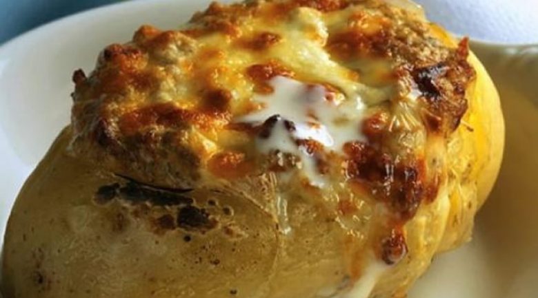 - Desligue o fogo e pegue porções de purê e do recheio e dívida nas cavidades das batatas