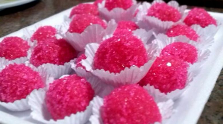 - Passe pelo açúcar cristal e coloque nas forminhas de brigadeiro