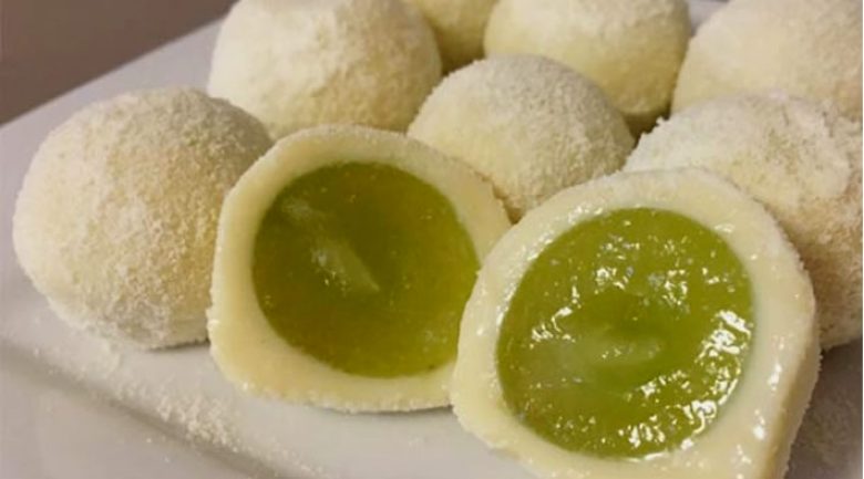 - Com uma colher de chá, pegue o brigadeiro branco, abra na palma da mão e coloque a uva.