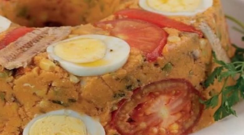- Enquanto isso, decore o fundo de uma forma redonda de buraco no meio com as rodelas de tomate, as rodelas de ovo cozido, o palmito, a ervilha, a azeitona e a sardinha