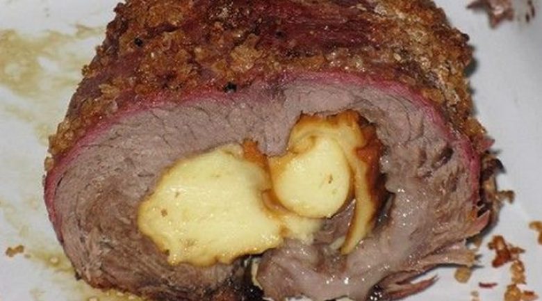 - Misture os ingredientes do recheio, recheie a carne e prenda com palitos