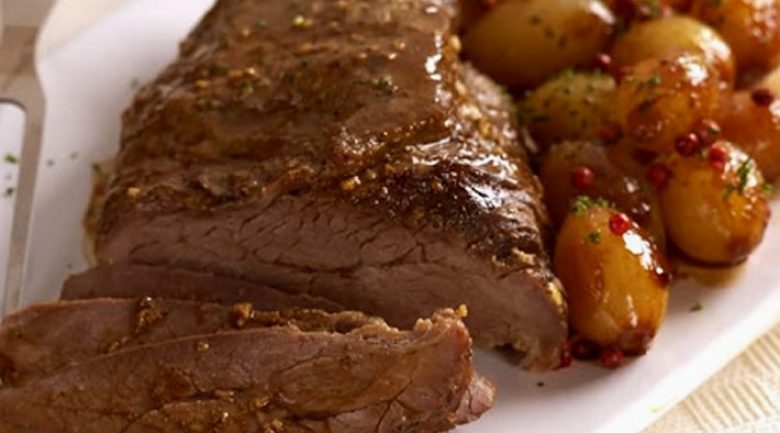 - Distribua a carne fatiada em um refratário regue com o molho e acomode as batatas