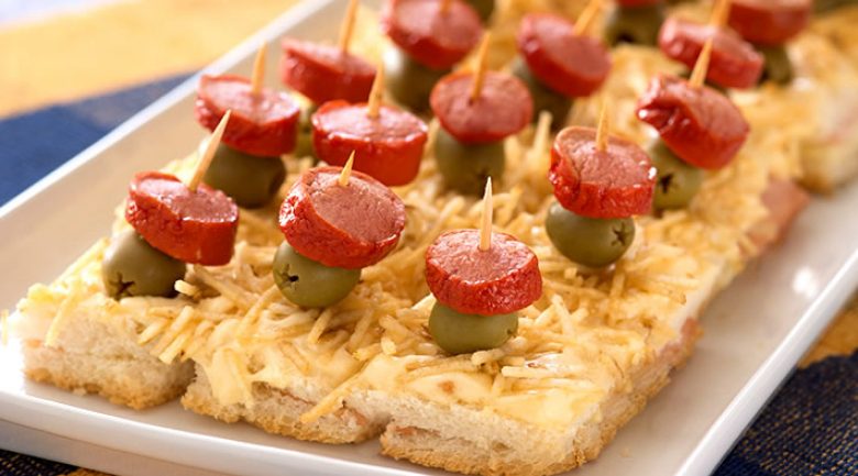 - Corte em 4 partes e espete, em cada uma, uma azeitona e uma rodela de salsicha