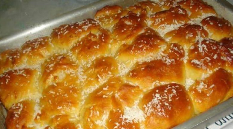 - Pincele leite de coco em cada pão e polvilhe coco ralado