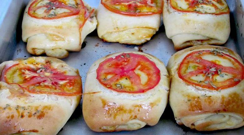 - Coloque uma fatia de presunto, outra de queijo mozarela e enrole o pãozinho