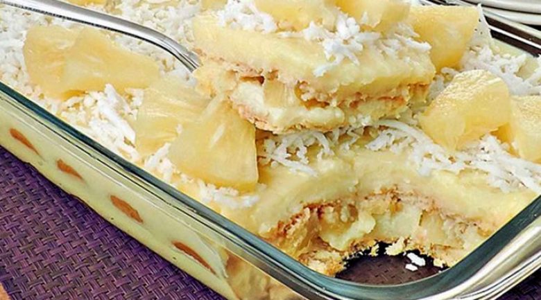 - Para a montagem, em um refratário médio, faça camadas do creme de abacaxi, do bolo umedecido na calda reservada e do abacaxi misturado com a hortelã picada acabando em creme